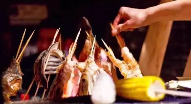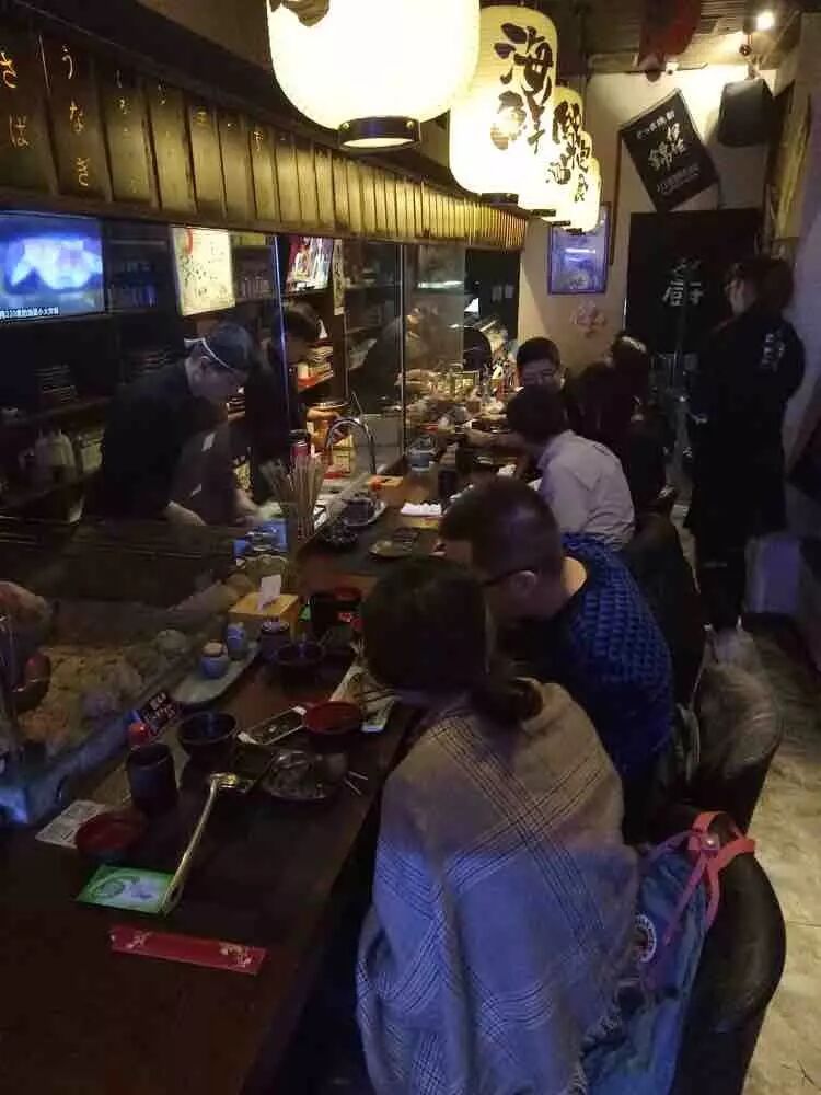 店里采用开放式厨房,寿司师傅从切鱼片到捏寿司的整个过程都会呈现在客人眼前。干净透明的玻璃上,食客和厨师的身影交相倒映,烤串儿正发出令人愉悦的细微的滋滋声。