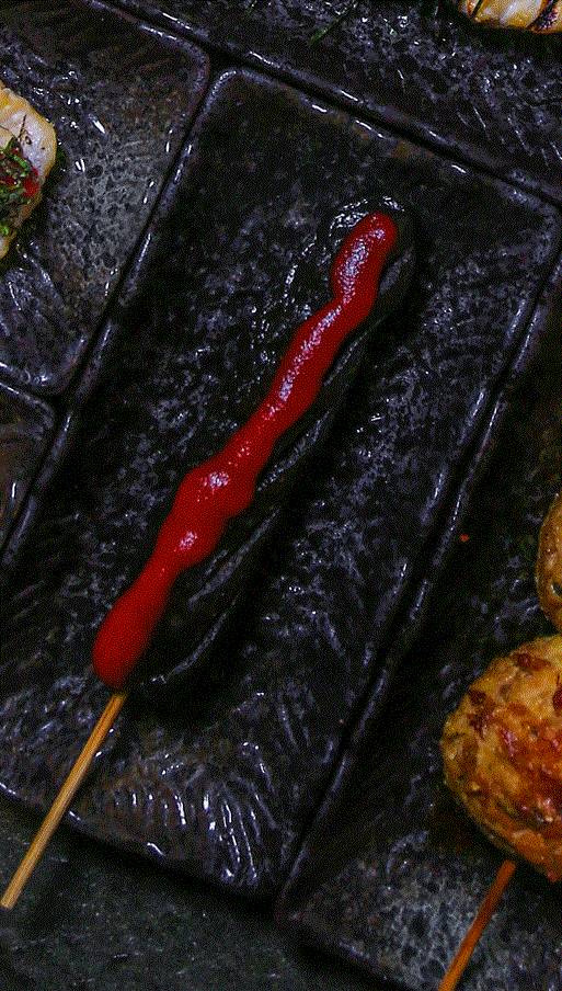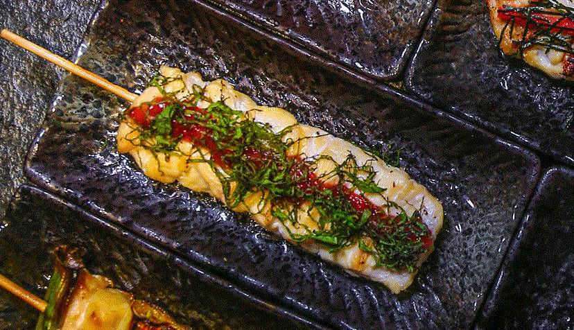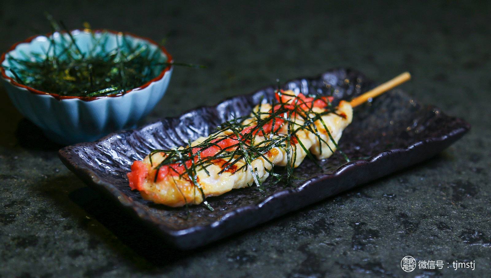 小小的串烧也要色香味俱全,可见店主十分用心。鲜嫩的鸡胸肉上裹着一层金光闪闪的明太子,再点缀些许海苔丝,进一步提升了菜品的口味。
