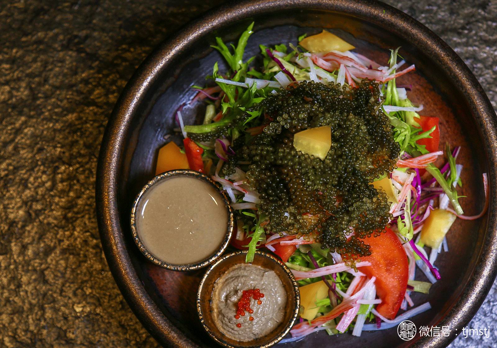 外观浑圆饱满的海葡萄如同一串串晶莹剔透的小葡萄,口感像极了鲑鱼卵,咬起来会有卜滋卜滋的声音,美丽的绿色小颗粒散发出海味的咸鲜芳香,颇有鱼子酱的神韵。搭配蟹柳和蔬菜,再把蟹膏搅在一起吃,十分的鲜美。