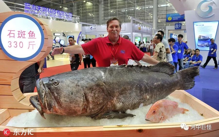 2017年6月30日,2017海峡(福州)渔业周·中国(福州)国际渔业博览会在福州海峡国际会展中心开幕,一名来自美国的嘉宾在展位上与330斤的石斑鱼合影。