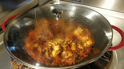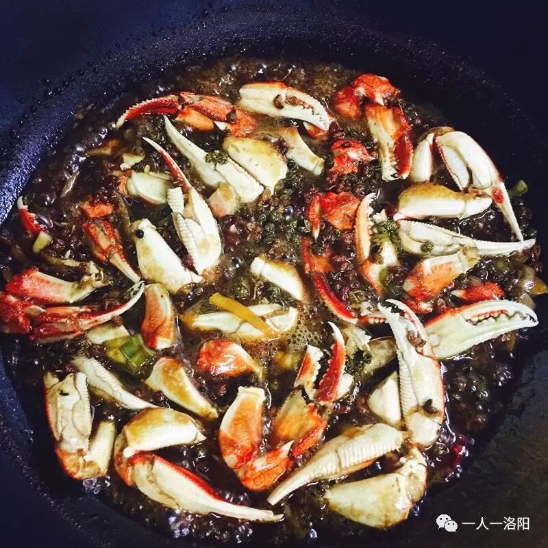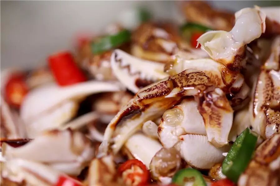 热油、炒料、炒螃蟹、放入配料、起锅...
