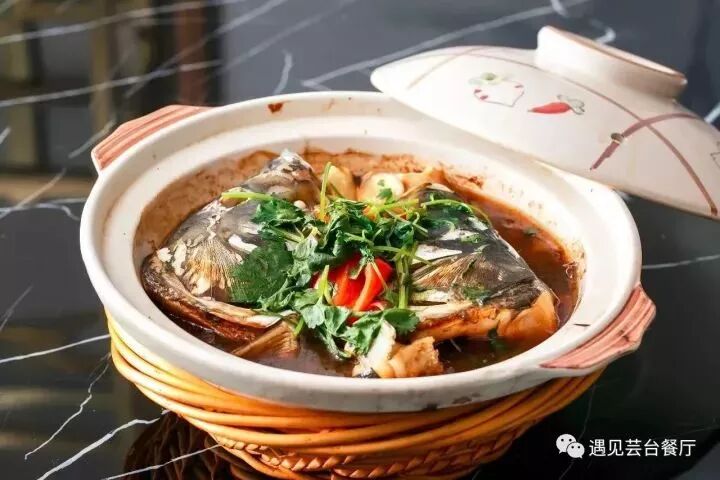 将几斤重的花鲢鱼头连着鱼肉直接放于瓦煲中,放了很足的调料,干葱、蒜子、香叶、八角等,五味俱全,猛火直接加热,食材在煲中由生转熟,这股热腾之气一直连贯到餐桌。再揭开这锅盖的一瞬间,香气熏满整个空间,鱼肉没有一丝土腥味。鱼肉本身的汁水都被锁住,垫底的蒜子经过高火加热,增添了独特的烟熏风味。
