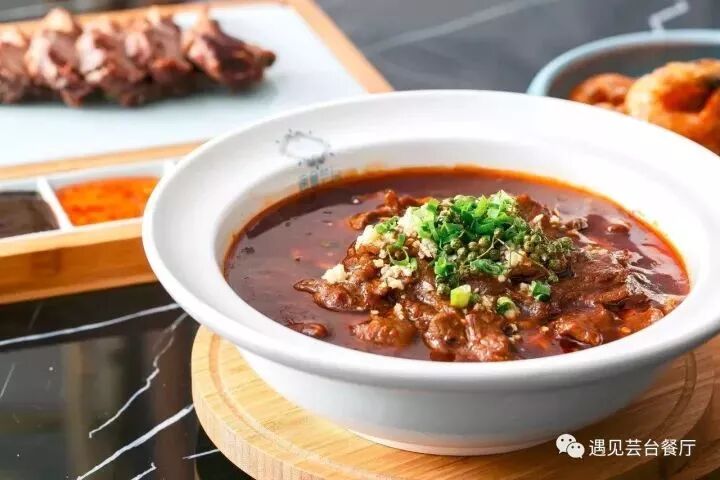 水煮牛肉的创新做法,选用口感有韧劲的安徽豆皮垫底,再用洋葱、胡萝卜、芹菜等多种蔬菜加鲜啤榨汁后腌制牛里脊,这样做出来的菜汁牛肉不仅牛肉鲜嫩而且还菜汁浓郁。