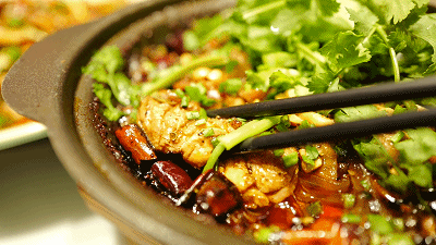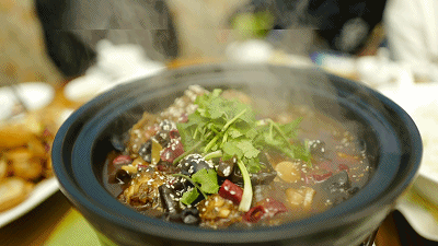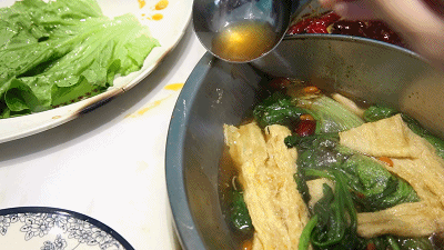 不过有一点扎堆要提醒,这个锅的边缘很烫,容易被烫到,有位小姐姐夹菜的时候就不小心烫到了。汤汁浇上去都能听到滋啦啦的声音。