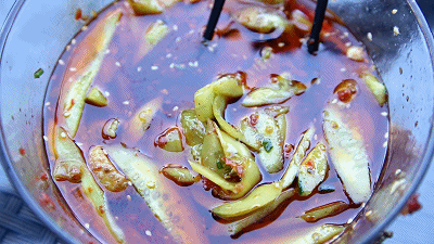 看这一盘辣椒满当当的辣子鸡,浩浩说跟他小时候楼下川菜馆的味道很像...老板送的口水鸡成为最欢迎的菜,鸡肉被夹光光,垫在底下的黄瓜片也是清脆的很~