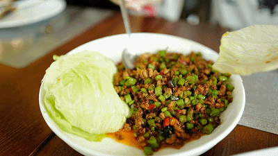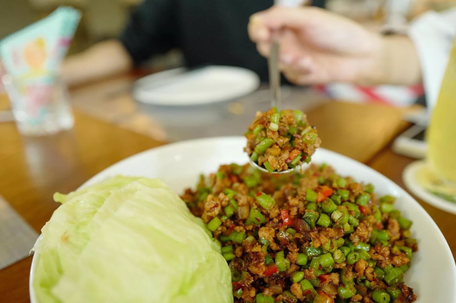 生菜的甜脆与肉沫豆角裹在一块,有丰富的层次感。吃这道菜动手包比坐着吃还舒服。另一道长得像肉粽的东东里面是鸡肉,裹了一层叶子后放入油锅油炸,避免热油直接接触,少油健康。