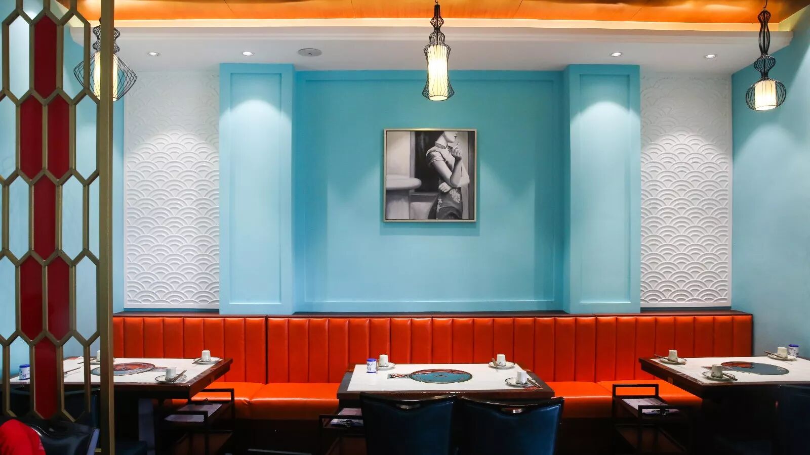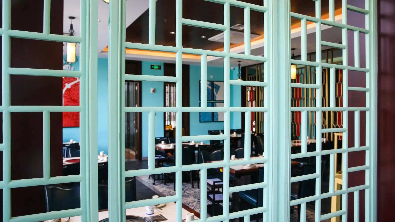 以天蓝色为装修基调,屏风、栅栏以及挂壁都有复古风味。尤其是挂着的旗袍壁画,极具美感。