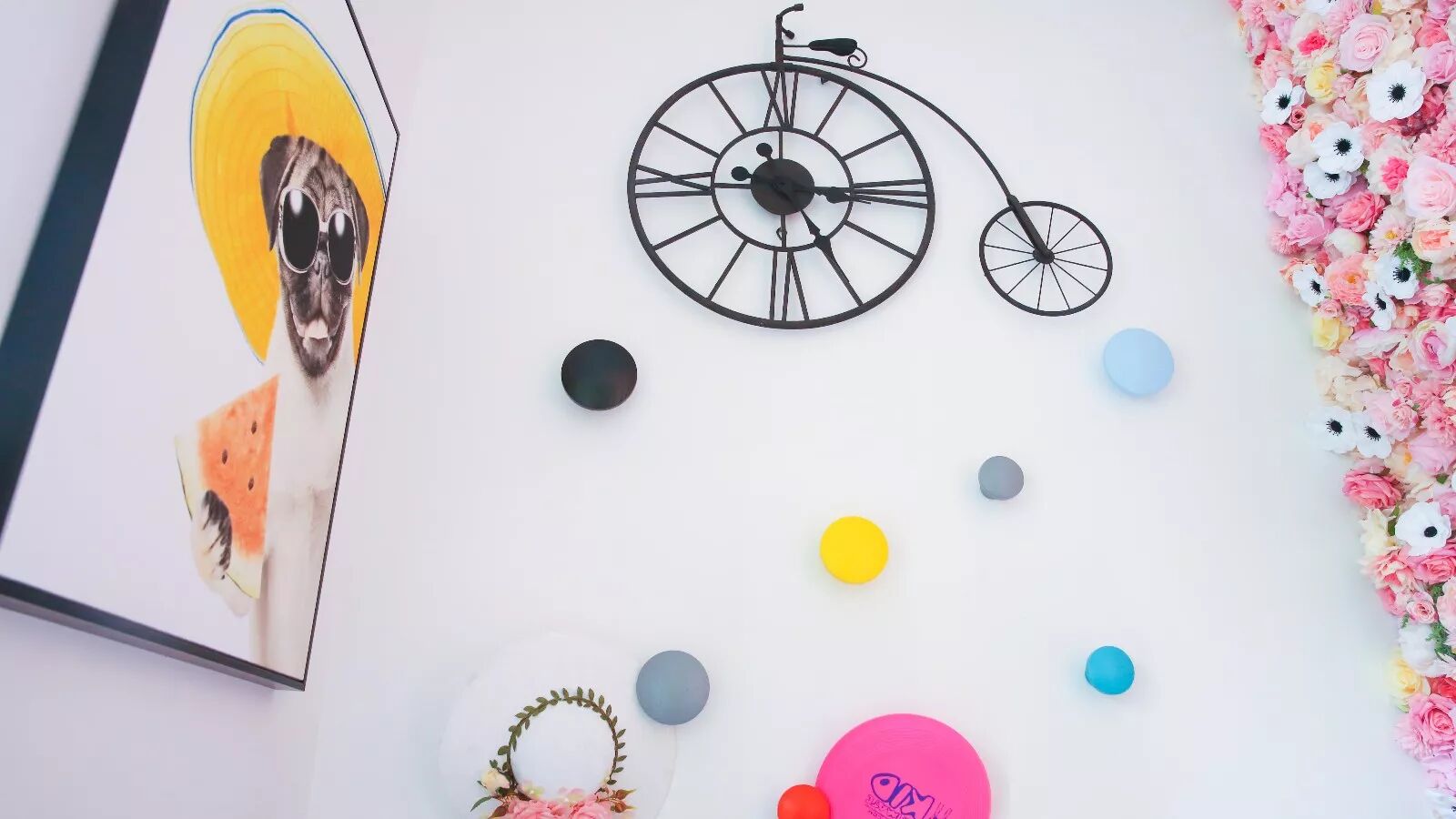 墙壁旁边摆放着各种不同的小道具,用来丰富你的拍照姿势。可爱的小眼镜、女神气息的花环和不同标语的牌子,相信任何一个女生都会爱上这里。