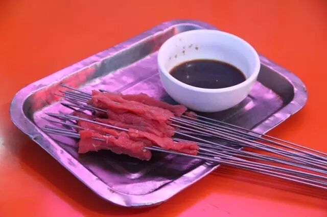“肉串生吃”这个吃法,也是头一个从这家流传出去的。肉是选用瀍河供的正宗上好牛肉,把牛里脊最中间的那层肉芯给抽取出来,在保证绝对新鲜的情况下,不做任何处理,配上生抽芥末。“一蘸即走,入口品人生”。
