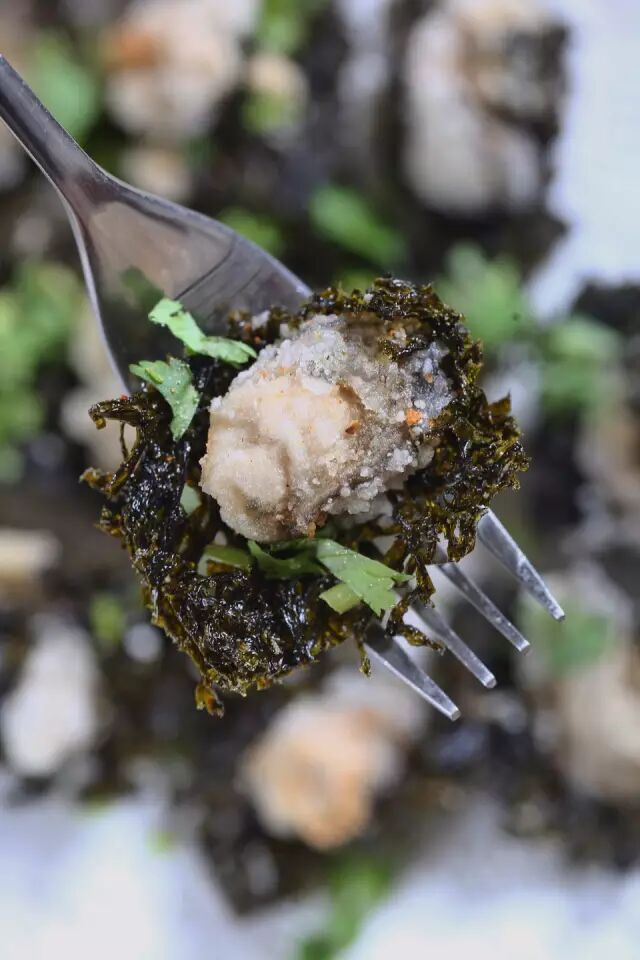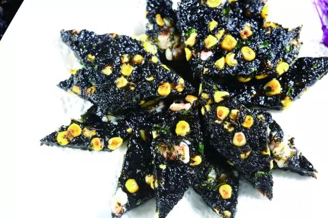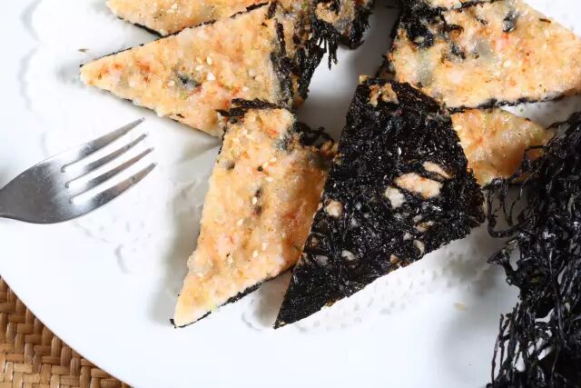 紫菜除了和虾仁搭配,还加入玉米粒,带来海洋的清新。虾仁、紫菜一起剁碎,加入玉米粒、生粉,用中火在不粘锅上煎熟。