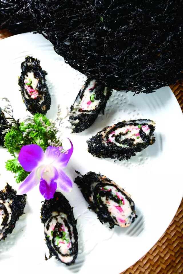 海皇紫菜卷做法简单且不油腻,将虾胶和蟹柳通通包入卷起蒸熟。