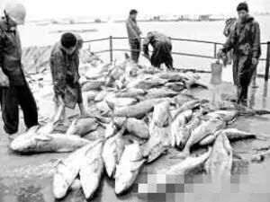1月16日下午,荣成渤海水产养殖公司工人将养殖网箱内冻死的鲟鱼捞出。养殖公司称直接损失超千万元。