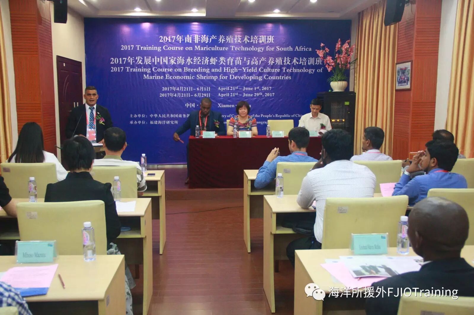 、福建海洋研究所承办的中国对外援助培训项目“2017年南非海产养殖技术培训班”和“2017年发展中国家海水经济虾类育苗与高产养殖技术培训班”于4月21日在福建海洋研究所联合开班。厦门市商务局对外经济合作处郑艳慧副处长代表主办单位,福建海洋研究所连张飞副所长代表承办单位,巴拿马水产资源管理局伊凡·莫拉莱斯副局长(副部级)、南非学员哈莫尼·恩科比尼先生分别在开班仪式上致辞。“2017年南非海产养殖技术培训班”的18位南非学员将参加为期42天(4月21日至6月1日)的专业学习交流。“2017年发展中国家海水经济虾类育苗与高产养殖技术培训班”来自柬埔寨、孟加拉国、斯里兰卡、加纳、卢旺达、巴拿马、秘鲁、墨西哥等40位学员将参加为期 70天(4月21日至6月29日)的专业学习交流。