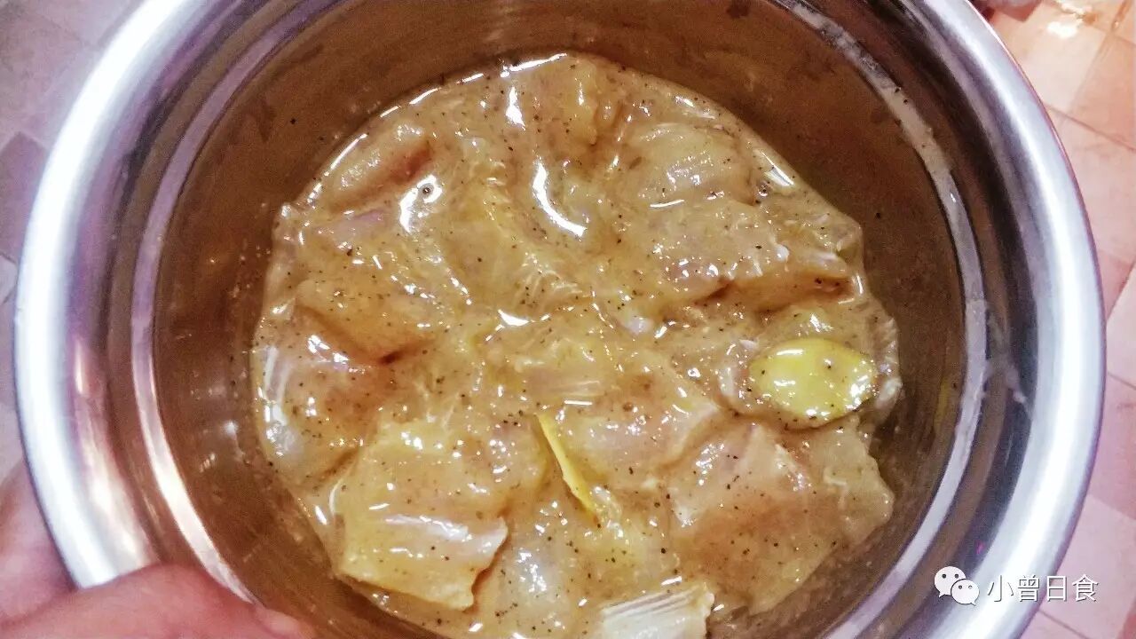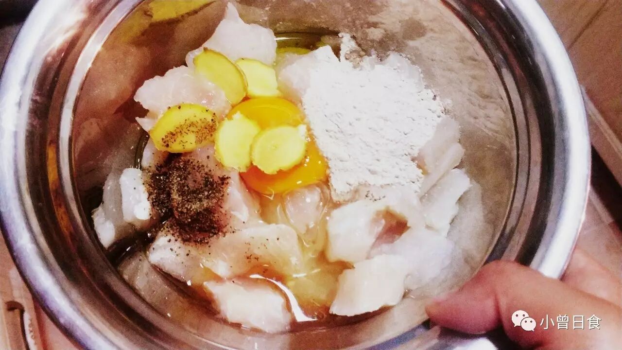 2、鱼肉切冰块左右大小,加入鸡蛋、淀粉、料酒、黑胡椒、盐、姜片腌制15-20分钟;