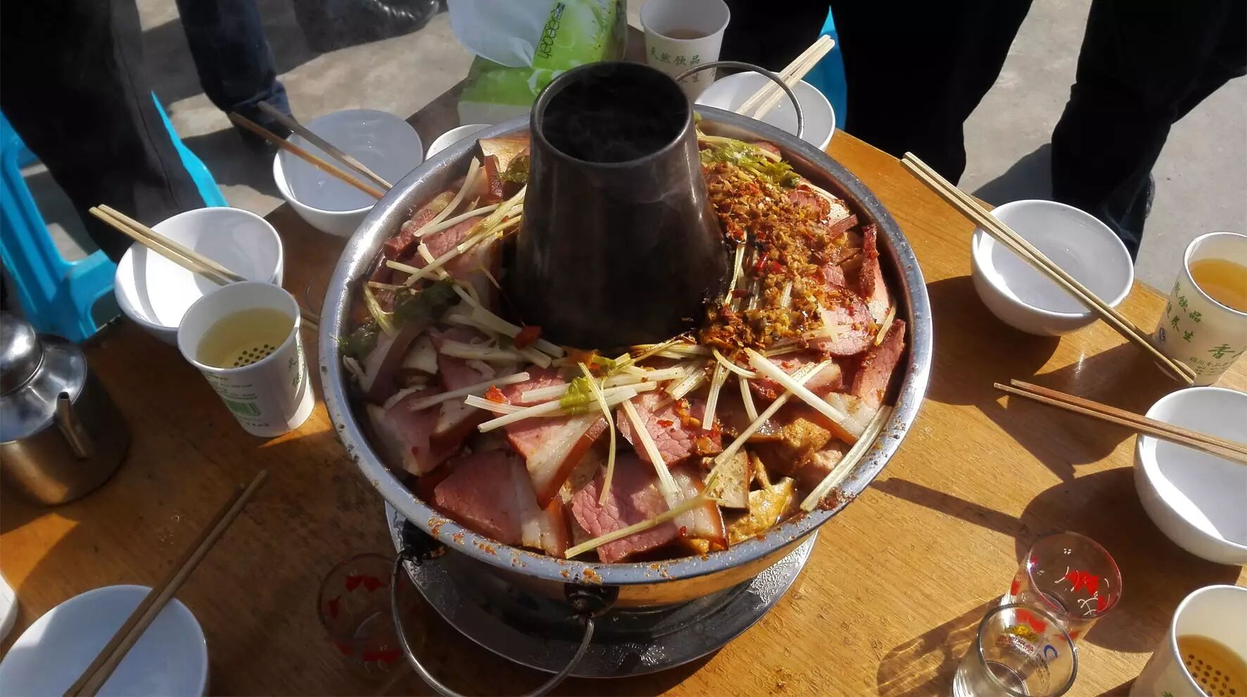 芥末粉皮1份、五香肘花1份、大盘鸡1份、鱼香肉丝1份、核桃肉1份、麻辣豆腐1份、韭菜鸡蛋1份、三鲜汤1份、面一盘。