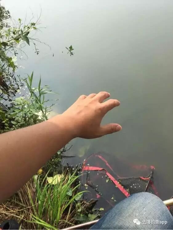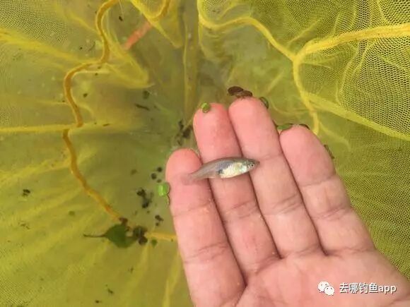用抄网抄起一条食蚊鱼鱼苗,赶紧放入水中,还它自由,等你长大了,我再来钓。
