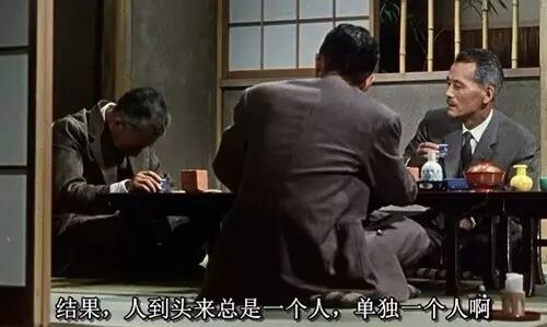 《秋刀鱼之味》开头平山先生的老师父女境况却是一条如镜像般的故事副线,同样相依为命的老师和他的女儿,在人生的最后时刻都是孤独的,这就是平山的可见的未来,这种即将来的孤独是投射在人生晚年岁月中的阴影,不知不觉吞噬掉亲情的温暖和人性的良善。它和平山嫁女的主线相互交织,深化了“无论是悲是喜,而人生终归于一人的落寞”的人生主旨。而此时现实中的小津安二郎已是60岁的老人,母亲的离逝更加如秋风阵来的悲凉触动导演的内心。