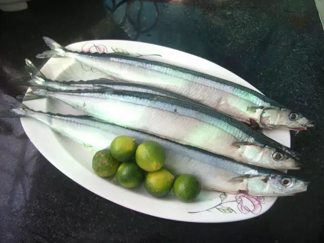鲜秋刀鱼1条、鲜柠檬半个、小洋葱1个、橄榄油5克、盐1克、黑胡椒1克。