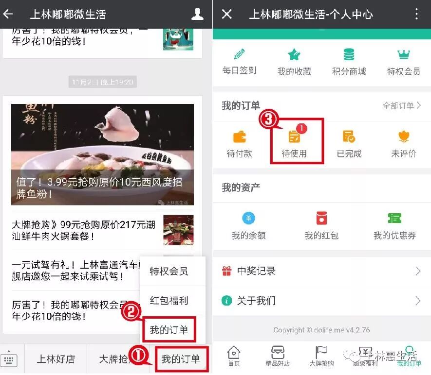 1.在【上林嘟嘟微生活】或【上林惠生活】底部菜单栏-【我的订单】,在【我的订单】点【待核销】找到已经抢购的商品,点击,找到核销码,凭该核销码至店家进行核销即可。