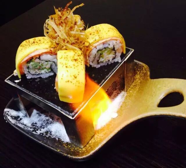 上桌自带炫酷火焰,视觉效果一级棒,还有淡淡的白兰地香味~~寿司卷里面用料十足:青瓜,蟹柳,三文鱼和芝士,吃起来层次那叫一个丰富。