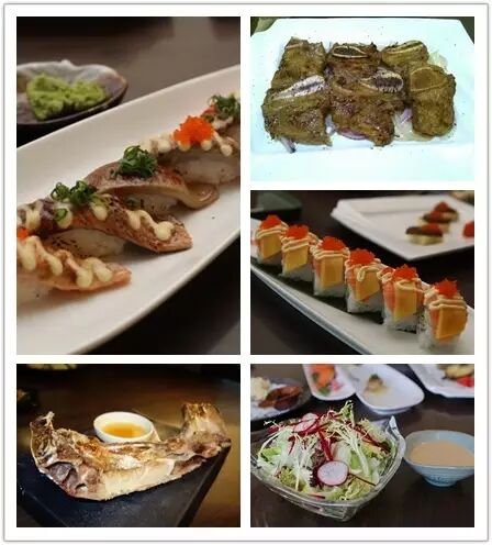 刺身盛合(一盘)、火焰烧寿司(5合拼)、牛仔骨(一份)、香芒反卷寿司(一份)、盐烧金枪鱼腩脖(一份)、野菜沙拉(一份)