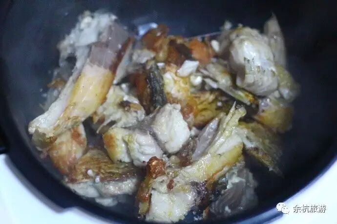 5、煎好的鱼放入压力锅中