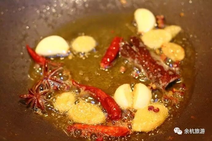 7、锅烧热后,倒入少许油,加入生姜片、蒜、花椒、桂皮、八角、干红辣椒小火慢慢翻炒