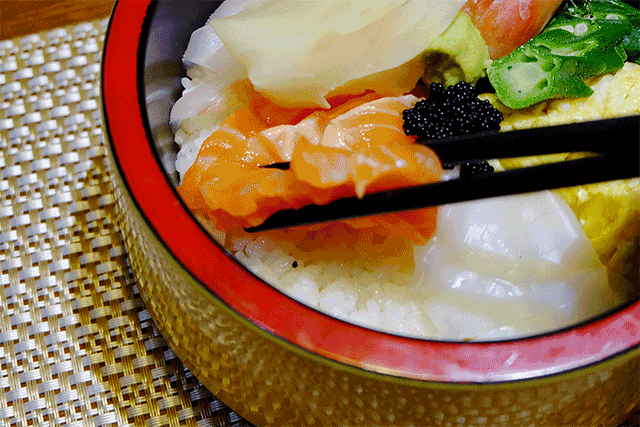 散寿司的吃法很特别,筷子从刺身上垂直下夹直到夹到米粒,根据自己随意调节刺身的份量和米饭的多少,连日本人都笑言说这应该是深圳目前最好吃的寿司了。