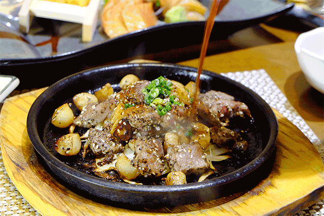 牛肉上桌前会先事先小煎一会,看似不烂不惊的牛肉实际上还保留了较高的温度,用酱汁绕圈子淋在牛肉上,顿时香气四溢滋滋作响。