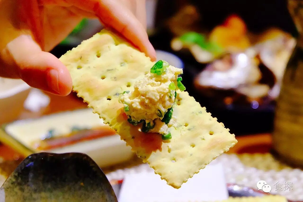 细腻的咸芝士上面撒上葱段,用勺子挖一块放置在饼干上,芝士连同饼干一起咬,细滑的芝士和饼干的脆香交融,芝士可能会稍咸一些,勺起的芝士份量适量最好。