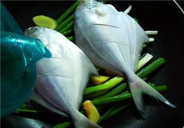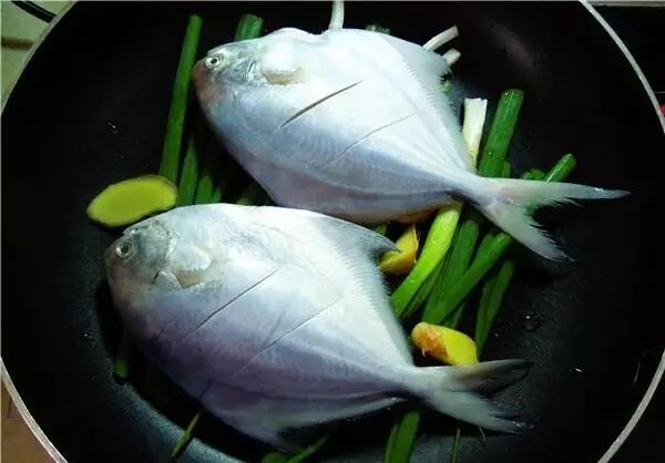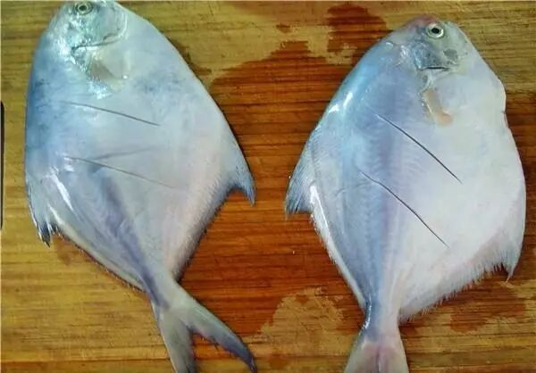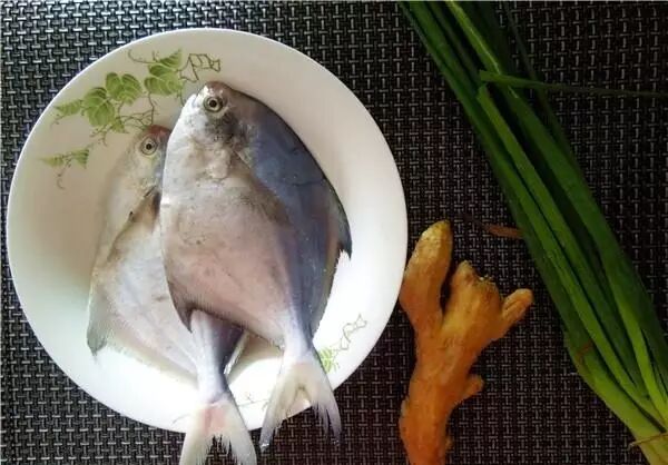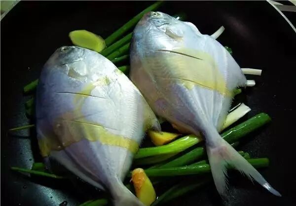 鲳鱼去腮和肚,洗干净,两面斜划两刀,用少许盐抹一下,腌15-30分钟。