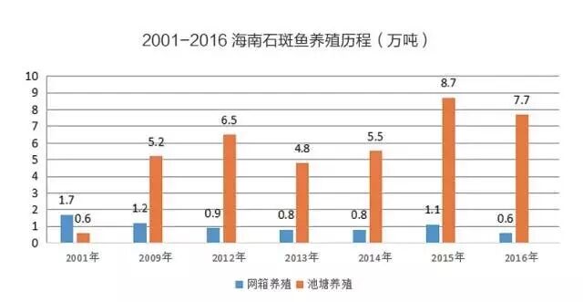 据了解,海南的石斑鱼养殖在2015年开始爆发性增长。据统计,2015年产量同比2014年增加了40%-50%。当时有人预测,2016年总养殖量或突破10万吨。然而,事实上,2016年养殖量增速并达到预期,相反,总量仅8万吨左右,较2015年下跌近2万吨。