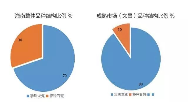 海南的石斑鱼产业经过二十几年的发展,已经形成了一条具备种苗、饲料、养殖、销售等各环节的完善产业链。据不完全统计,2016年海南石斑鱼产量约8万吨,占全国总产量的8成以上。其中,珍珠龙趸养殖量占海南石斑鱼总量的7成,其余特种例如青斑(青石斑)、老虎斑(棕点石斑)、东星斑(青星九棘鲈)、老鼠斑(驼背鲈)等品种占据不到2成。海南晨海水产有限公司董事长蔡春有表示,大宗品种规模化养殖逐渐让个别劣势特种市场萎缩,甚至淘汰出市场。《农财宝典》走访琼海、文昌等较为成熟的养殖区域,也珍珠龙趸养殖养殖比例接近9成。