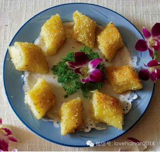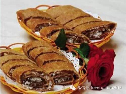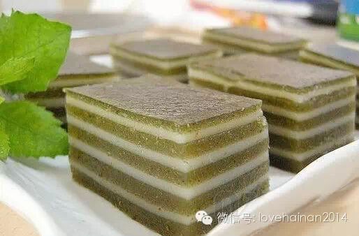 这一传统小吃形成于清代。用料为大米粉、菱粉、椰子汁、白糖,调色用的香兰草、火龙果汁等。先将大米粉和菱粉拌成糊状,再加入椰子汁和白糖,分三份,在每份中各调入三种不同食用色素,隔水煮,每熟一层再加一层不同颜色糊料复蒸,至九层为止。成品美观鲜艳,营养丰富,食用时口感韧性好,香甜可口。