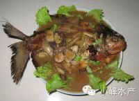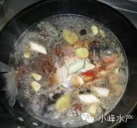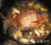 7.翻一下面后倒入清水,清水没过鱼身,再放入蒜、葱、姜、八角、酒、醋、料酒、酱油、鸡精,开大火炖,等汤开后改中火炖