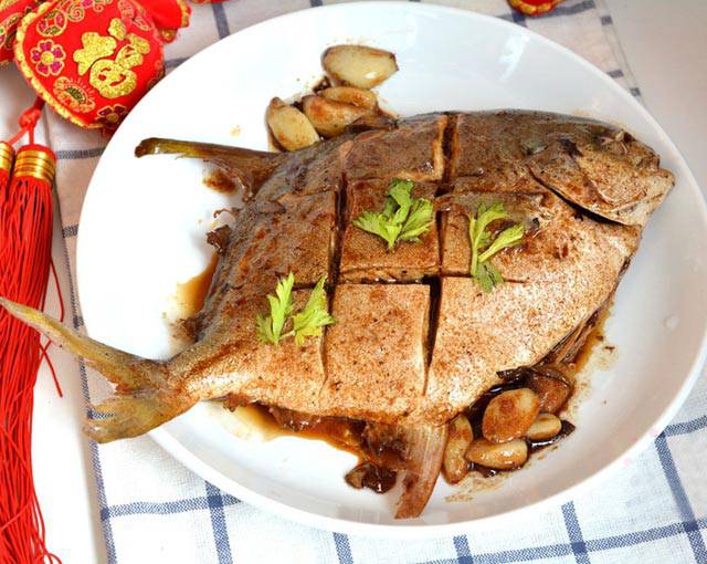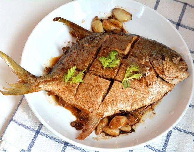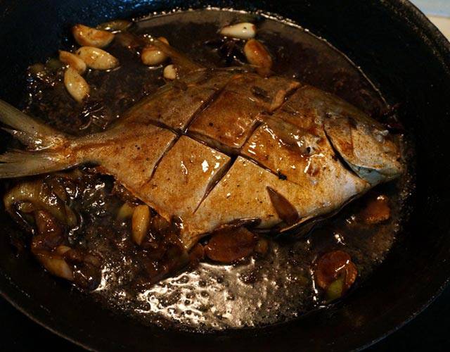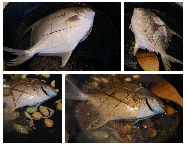 锅中多放些油煎鱼,煎至鱼身略鼓起。在锅空地方放葱姜蒜煎香,倒料酒和酱油。