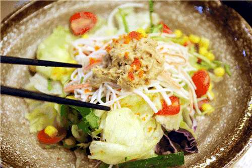 吞拿鱼就是金枪鱼,肉质柔嫩鲜美,和内软外酥的蟹肉丝、蟹籽、生菜、玉米粒、黄瓜、圣女果等一起拌成沙拉。