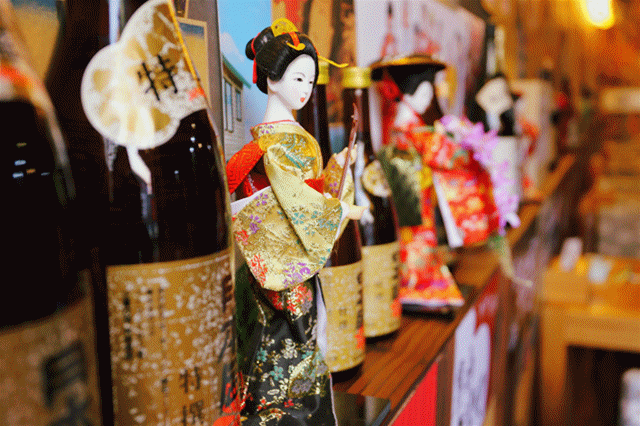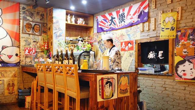 锦鲤图案的酒旗帷幔下,暖黄色的灯笼、浮世绘风格的仕女图壁画、日本各年代的电影海报等等,将店内的环境营造出居酒屋的风格。