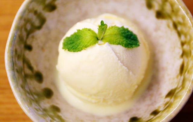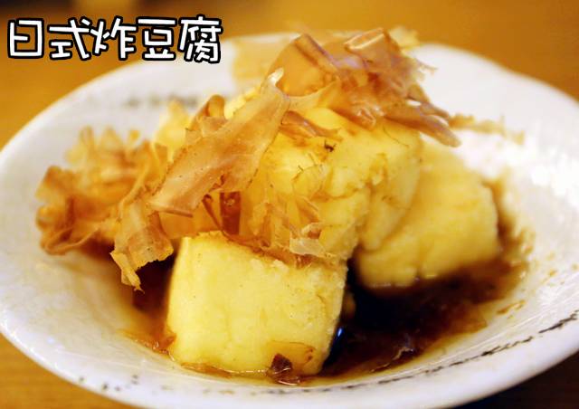 豆腐装入碗中,淋上调好的料汁,上面放了鲣鱼薄片做装饰。夹起一块入口,外酥内软,口感Q弹,酱汁鲜中带甜,还有丝淡淡的酒香。