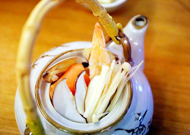 日式土瓶蒸属于清汤类,更是非常日本的一种吃法。小小一个土瓶蒸,用料却大写的良心!一片片松茸、菌类,三文鱼、鲜虾和蛤蜊肉大块又肥美~
