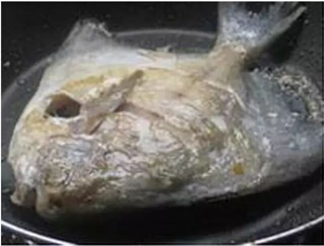 5.炒锅烧热,用姜块擦拭锅底,放入少许油烧热,将鲳鱼放入锅中,用小火煎至两面金黄色后,盛出沥油
