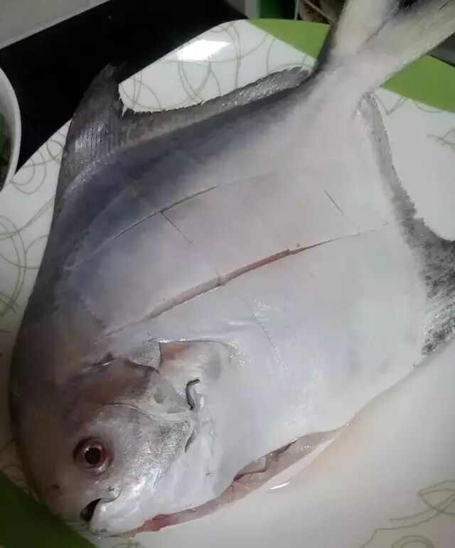 1.鲳鱼去内脏后用水冲洗干净,在鱼的身上两侧斜划两三刀