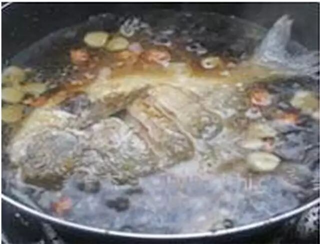 7.再加入适量清水(水与鲳鱼持平),大火烧开后转小火煮至汤汁浓稠,将鲳鱼盛出盘中