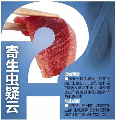 不少网友感慨,吃生食太恐怖,不敢再吃;也有网友庆幸,吃生食时,自己都会蘸醋,应该不会长寄生虫;还有网友质疑,吃生食不可能会全身长寄生虫。那么,吃生鱼片是怎么长寄生虫的?拍片会不会看到寄生虫?吃生鱼片要注意些什么?不少网友高呼,求证实,求解答。
