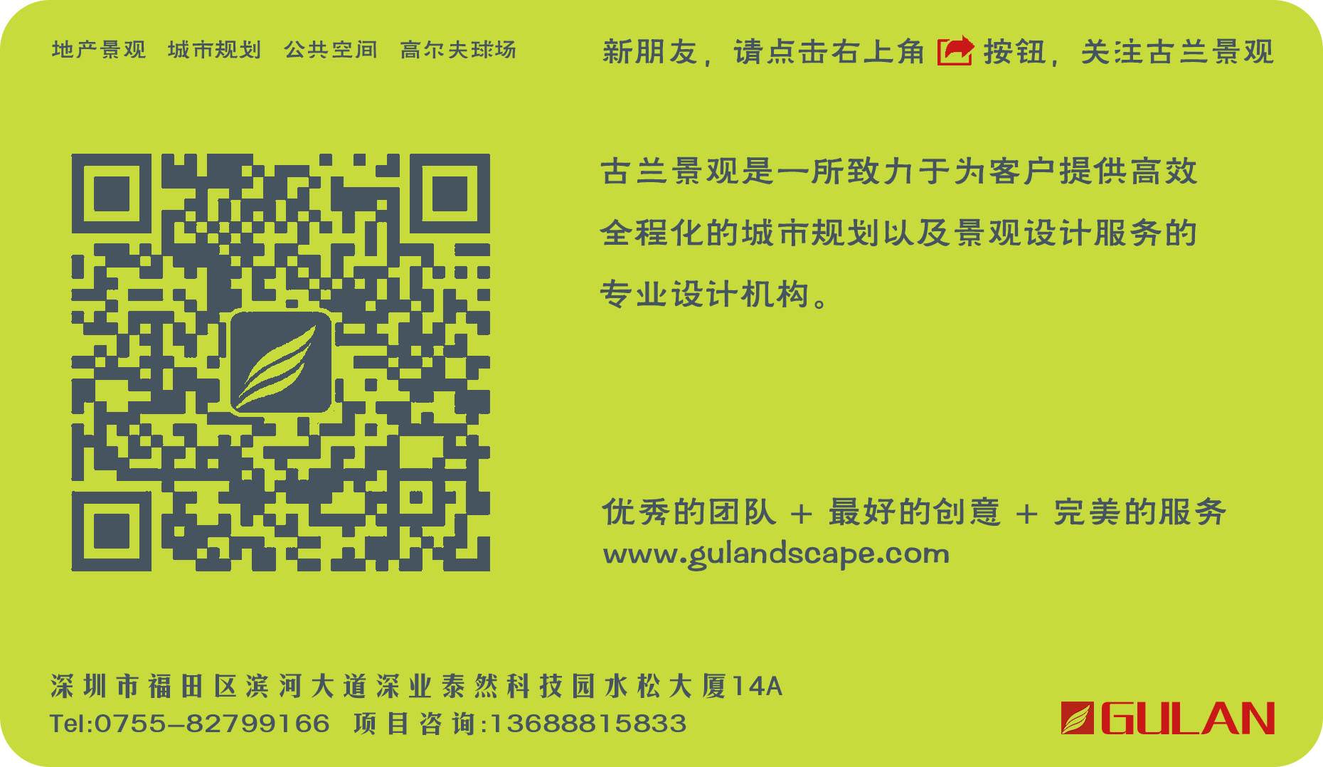 GULAN是一所致力于为客户提供高效、全程化的城市规划以及景观设计服务的专业设计机构.我们倡导“理性艺术、创景生活”.热爱生活,尊重自然,寓激情于艺术是GULAN团队对于设计创新的认知所在.我们热爱生活,从生活中不断发现点滴的美丽,并把这些美丽融合进我们独特的艺术视野.