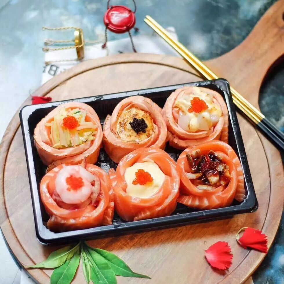 新升级的淳品七夕情人节特别款——三生三世,看这美美的颜值,简直裂炸少女心!厚切三文鱼,裹上各式内馅,颜值与口味齐飞~![]()