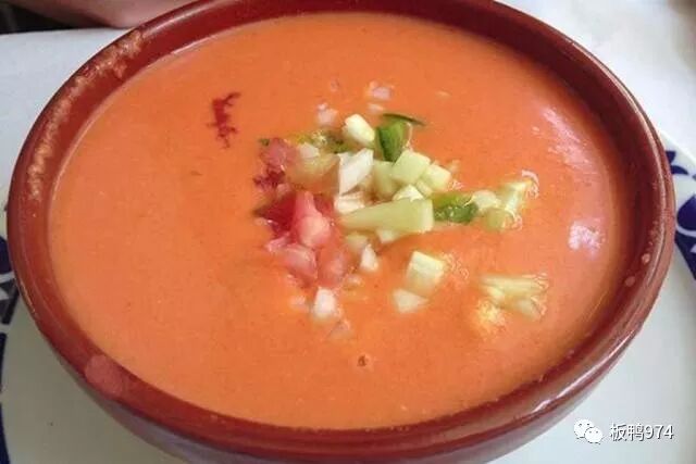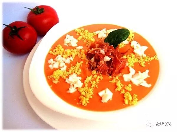 西班牙冷汤稠度较稀,可以直接当作饮品喝,而相比较而言,Salmorejo则更加浓稠,被当作餐前开胃菜。它是由番茄碎、面包屑和大蒜搅拌混合而成,还可以在食用时加入鸡蛋、火腿以及橄榄油。