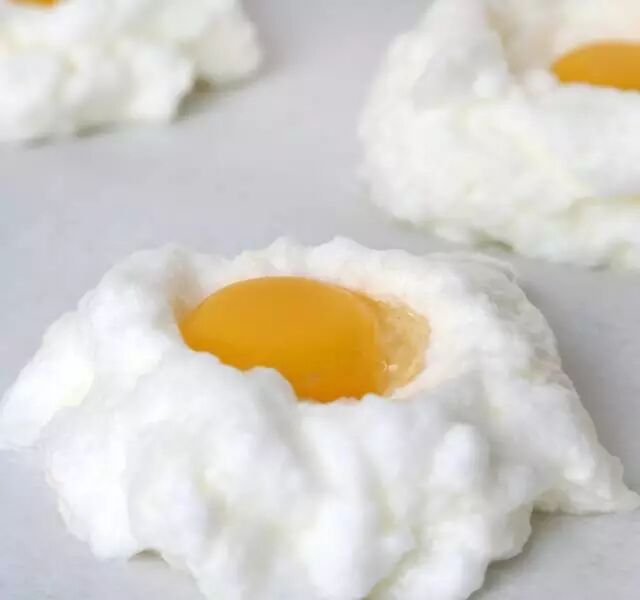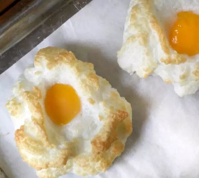 3.将蛋白混合物在准备的烤盘上用勺子堆成小山丘,然后把蛋黄放置在其中心,烤箱预热375°F,烘烤14-18分钟随喜好撒入盐和胡椒即可