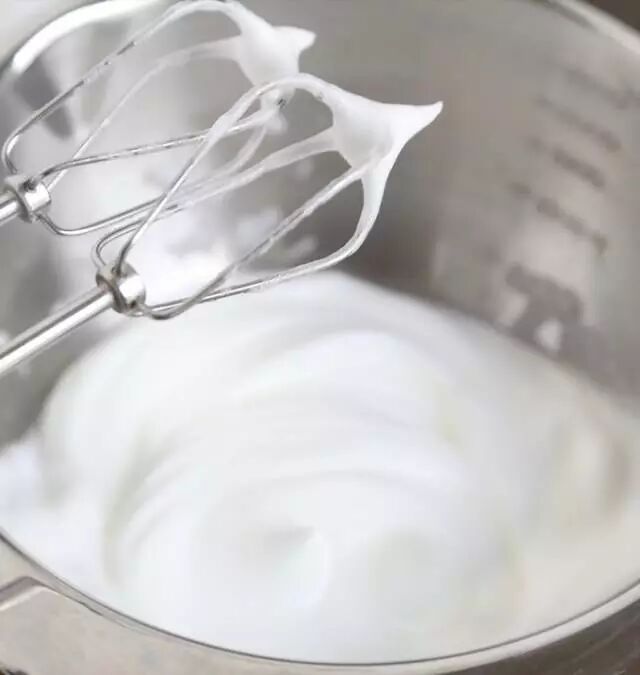 2.把蛋白与白砂糖混合,打至成奶油质感