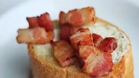 3 放油,将面包的两端放入平底锅煎至定型,撒盐,然后放上煎好的培根